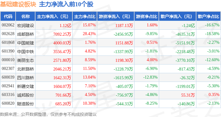 从资金流向上来看,当日基础建设板块主力资金净流出8.46亿元,游资资金净流入3.38亿元,散户资金净流入5.08亿元。基础建设板块个股资金流向见下表: