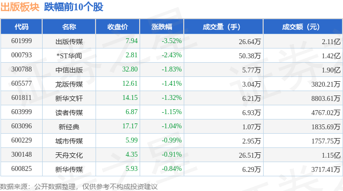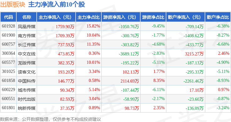 从资金流向上来看,当日出版板块主力资金净流出1.04亿元,游资资金净流入4434.95万元,散户资金净流入5987.48万元。出版板块个股资金流向见下表: