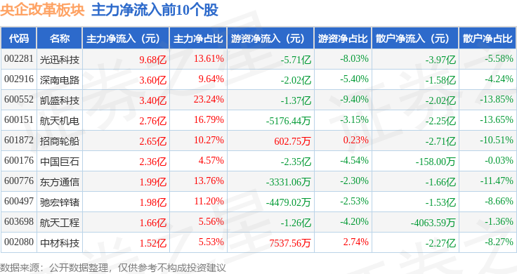 从资金流向上来看,当日央企改革板块主力资金净流出53.61亿元,游资资金净流入5.76亿元,散户资金净流入47.84亿元。央企改革板块个股资金流向见下表: