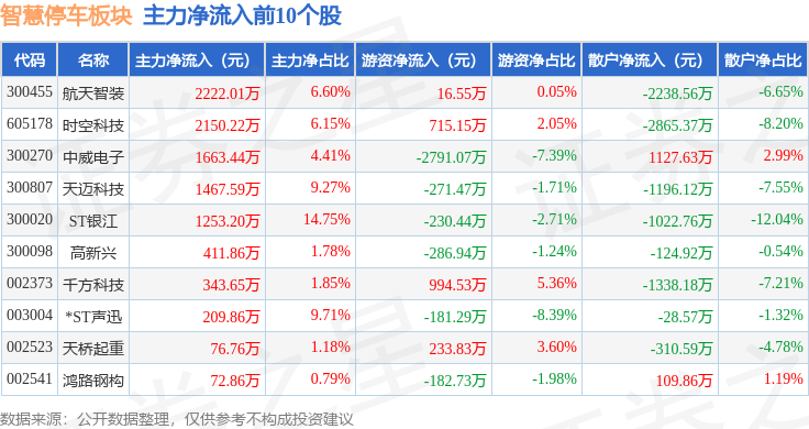 从资金流向上来看,当日智慧停车板块主力资金净流出7.39亿元,游资资金净流入3402.57万元,散户资金净流入7.05亿元。智慧停车板块个股资金流向见下表: