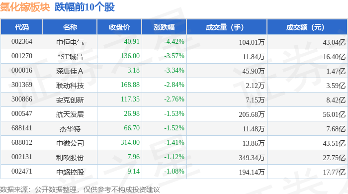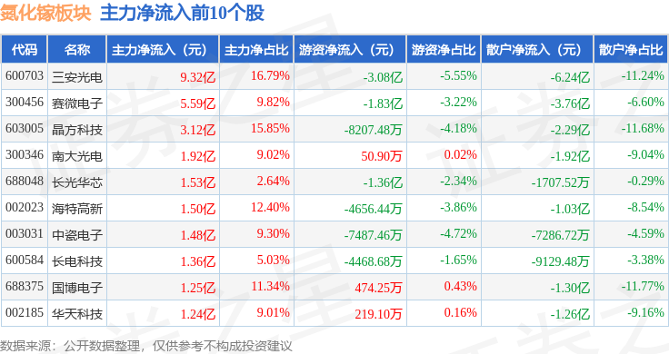 从资金流向上来看,当日氮化镓板块主力资金净流入1.99亿元,游资资金净流入1.28亿元,散户资金净流出3.27亿元。氮化镓板块个股资金流向见下表:
