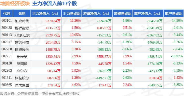从资金流向上来看,当日地摊经济板块主力资金净流出1.55亿元,游资资金净流入6429.99万元,散户资金净流入9062.96万元。地摊经济板块个股资金流向见下表: