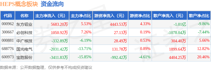 从资金流向上来看,当日HEPS概念板块主力资金净流入957.97万元,游资资金净流入3638.51万元,散户资金净流出4596.47万元。HEPS概念板块个股资金流向见下表: