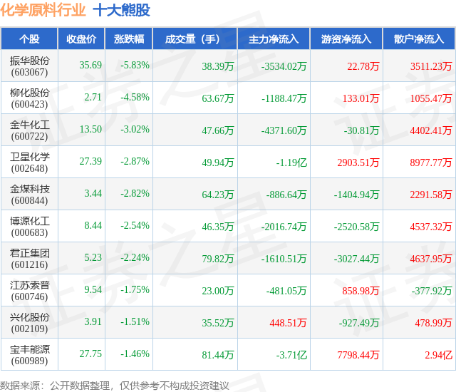 个股表现方面,化学原料行业当日领跌股为振华股份(603067),该股当日报收35.69,下跌5.83%,成交量38.39万,主力资金净流出3534.02万元。柳化股份(600423)以下跌4.58%紧随其后,该股当日成交量63.67万,主力资金净流出1188.47万元。除此之外,金牛化工(600722)、卫星化学(002648)、金煤科技(600844)均进入当日熊股之列。具体个股列表见下表: