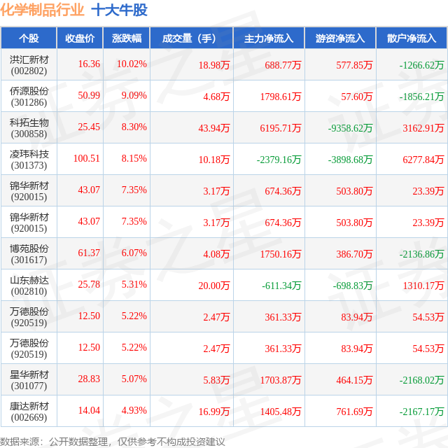 个股表现方面,化学制品行业当日领涨股为洪汇新材(002802),该股当日报收16.36,上涨10.02%,成交量18.98万,主力资金净流入688.77万元。侨源股份(301286)以上涨9.09%紧随其后,该股当日成交量4.68万,主力资金净流入1798.61万元。除此之外,科拓生物(300858)、凌玮科技(301373)、锦华新材(920015)均进入当日牛股之列。具体个股列表见下表: