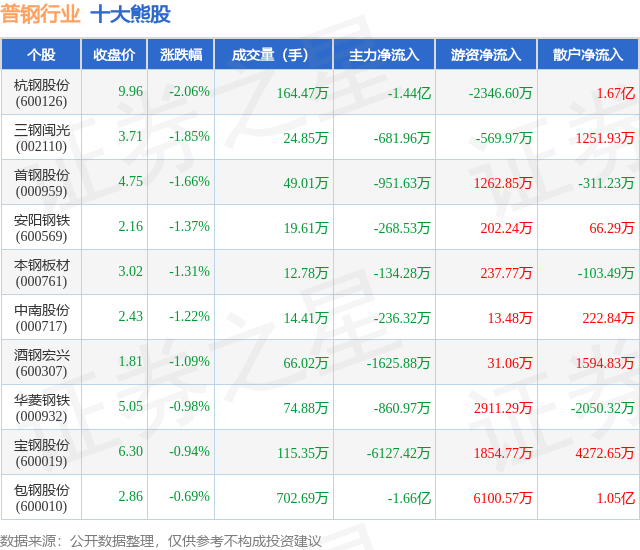 个股表现方面,普钢行业当日领跌股为杭钢股份(600126),该股当日报收9.96,下跌2.06%,成交量164.47万,主力资金净流出1.44亿元。三钢闽光(002110)以下跌1.85%紧随其后,该股当日成交量24.85万,主力资金净流出681.96万元。除此之外,首钢股份(000959)、安阳钢铁(600569)、本钢板材(000761)均进入当日熊股之列。具体个股列表见下表: