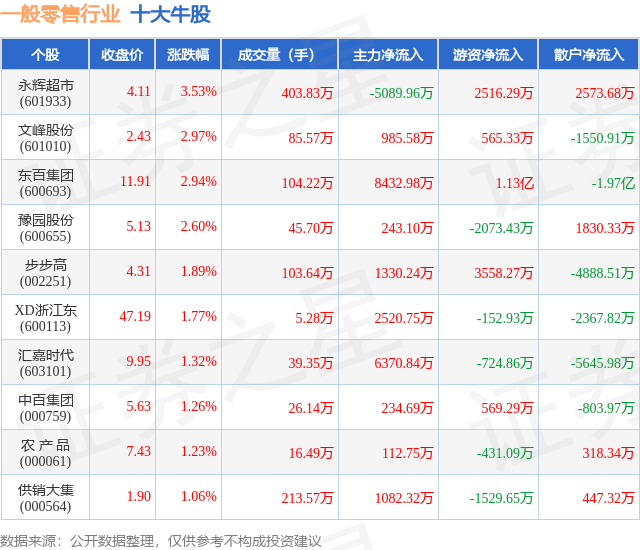 个股表现方面,一般零售行业当日领涨股为永辉超市(601933),该股当日报收4.11,上涨3.53%,成交量403.83万,主力资金净流出5089.96万元。文峰股份(601010)以上涨2.97%紧随其后,该股当日成交量85.57万,主力资金净流入985.58万元。除此之外,东百集团(600693)、豫园股份(600655)、步步高(002251)均进入当日牛股之列。具体个股列表见下表: