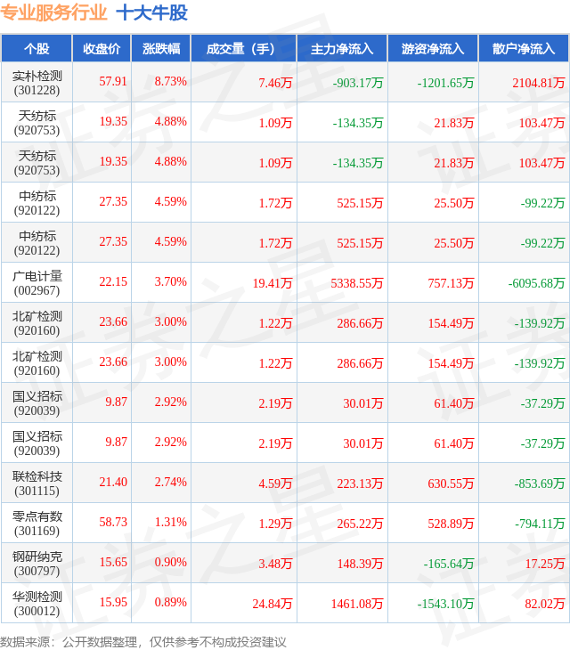 个股表现方面,专业服务行业当日领涨股为实朴检测(301228),该股当日报收57.91,上涨8.73%,成交量7.46万,主力资金净流出903.17万元。天纺标(920753)以上涨4.88%紧随其后,该股当日成交量1.09万,主力资金净流出134.35万元。除此之外,天纺标(920753)、中纺标(920122)、中纺标(920122)均进入当日牛股之列。具体个股列表见下表: