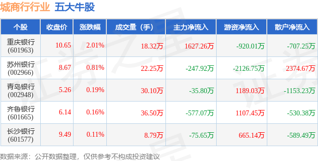 个股表现方面,城商行行业当日领涨股为重庆银行(601963),该股当日报收10.65,上涨2.01%,成交量18.32万,主力资金净流入1627.26万元。苏州银行(002966)以上涨0.81%紧随其后,该股当日成交量22.25万,主力资金净流出247.92万元。除此之外,青岛银行(002948)、齐鲁银行(601665)、长沙银行(601577)均进入当日牛股之列。具体个股列表见下表: