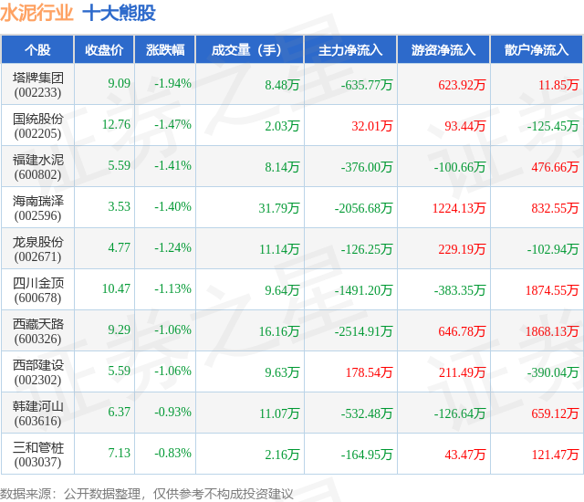 个股表现方面,水泥行业当日领跌股为塔牌集团(002233),该股当日报收9.09,下跌1.94%,成交量8.48万,主力资金净流出635.77万元。国统股份(002205)以下跌1.47%紧随其后,该股当日成交量2.03万,主力资金净流入32.01万元。除此之外,福建水泥(600802)、海南瑞泽(002596)、龙泉股份(002671)均进入当日熊股之列。具体个股列表见下表: