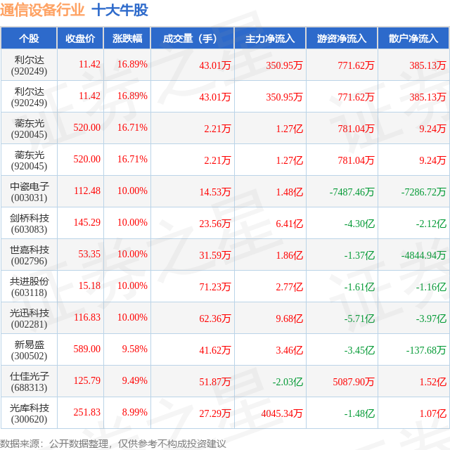 个股表现方面,通信设备行业当日领涨股为利尔达(920249),该股当日报收11.42,上涨16.89%,成交量43.01万,主力资金净流入350.95万元。利尔达(920249)以上涨16.89%紧随其后,该股当日成交量43.01万,主力资金净流入350.95万元。除此之外,蘅东光(920045)、蘅东光(920045)、中瓷电子(003031)均进入当日牛股之列。具体个股列表见下表: