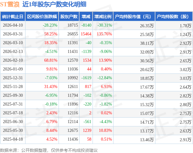 从股价来看,2026年3月31日至2026年4月10日,ST雪浪区间跌幅为28.23%,在此期间股东户数减少8140.0户,减幅为30.31%。