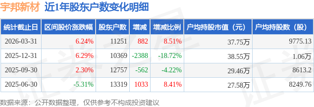 证券之星消息,近日宇邦新材披露,截至2026年3月31日公司股东户数为1.13万户,较12月31日增加882.0户,增幅为8.51%。户均持股数量由上期的1.06万股减少至9775.0股,户均持股市值为37.75万元。