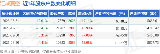 从股价来看,2025年12月31日至2026年3月31日,汇成真空区间跌幅为17.61%,在此期间股东户数减少3628.0户,减幅为17.11%。