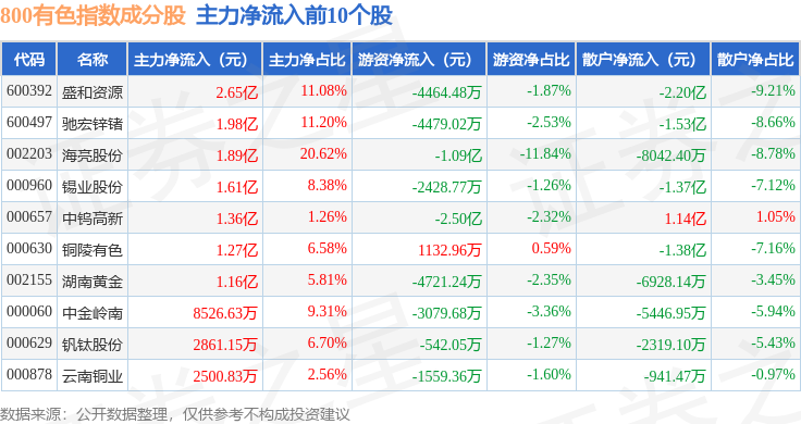 资金流向方面,800有色(000823)指数成份股当日主力资金净流出合计40.26亿元,游资资金净流入合计12.28亿元,散户资金净流入合计27.98亿元。成份股资金流向详情见下表: