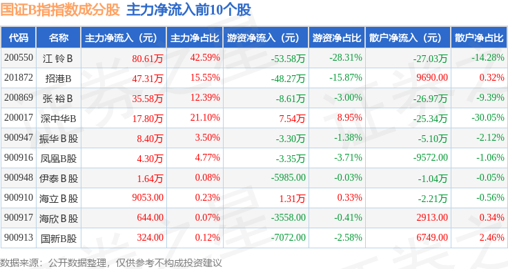 资金流向方面,国证B指(399318)指数成份股当日主力资金净流出合计1517.46万元,游资资金净流出合计120.13万元,散户资金净流入合计1637.6万元。成份股资金流向详情见下表: