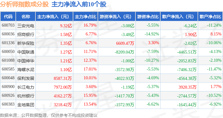 资金流向方面,分析师指数(399354)成份股当日主力资金净流出合计139.03亿元,游资资金净流入合计58.28亿元,散户资金净流入合计80.76亿元。成份股资金流向详情见下表: