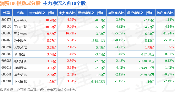 资金流向方面,消费100(399364)指数成份股当日主力资金净流出合计60.05亿元,游资资金净流入合计15.76亿元,散户资金净流入合计44.3亿元。成份股资金流向详情见下表:
