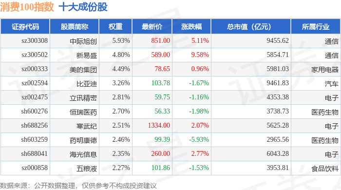 消费100(399364)指数十大成份股详情如下: