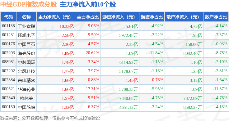 资金流向方面,中经GDP(399399)指数成份股当日主力资金净流出合计205.68亿元,游资资金净流入合计78.29亿元,散户资金净流入合计127.4亿元。成份股资金流向详情见下表: