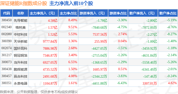 资金流向方面,深证储能R(470036)指数成份股当日主力资金净流出合计75.16亿元,游资资金净流入合计28.22亿元,散户资金净流入合计46.94亿元。成份股资金流向详情见下表: