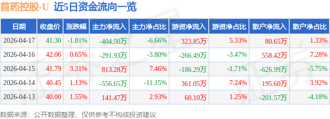 证券之星消息,截至2026年4月17日收盘,首药控股(688197)报收于41.3元,下跌1.81%,换手率2.3%,成交量1.47万手,成交额6076.8万元。