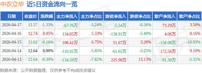 证券之星消息,截至2026年4月17日收盘,中农立华(603970)报收于12.57元,下跌1.33%,换手率0.62%,成交量1.66万手,成交额2091.42万元。