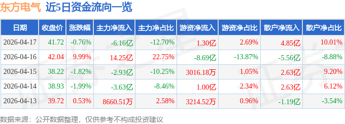 证券之星消息,截至2026年4月17日收盘,东方电气(600875)报收于41.72元,下跌0.76%,换手率5.12%,成交量115.96万手,成交额48.48亿元。