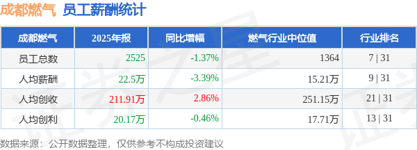 证券之星消息,4月18日成都燃气公布2025年年报,当年营收53.51亿元,同比增1.46%;净利润为4.81亿元,同比减1.54%。根据财报数据披露,当年公司员工总数2525人,同比减1.37%;人均薪酬22.5万元,同比减3.39%;人均创收211.91万元,同比增2.86%;人均创利20.17万元,同比减0.46%;公司员工薪酬统计见下表:
