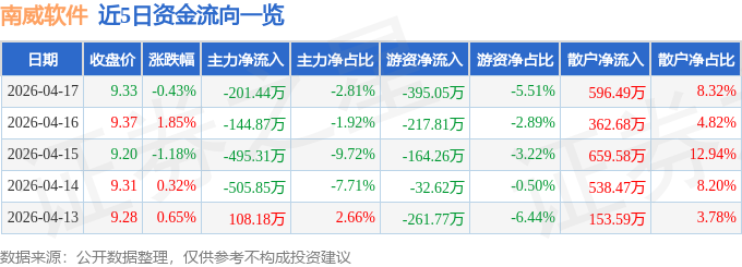 证券之星消息,截至2026年4月17日收盘,南威软件(603636)报收于9.33元,下跌0.43%,换手率1.33%,成交量7.73万手,成交额7173.16万元。