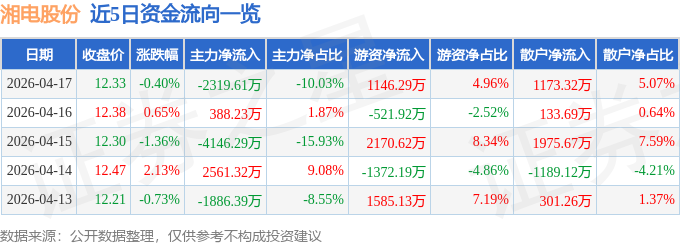 证券之星消息,截至2026年4月17日收盘,湘电股份(600416)报收于12.33元,下跌0.4%,换手率1.28%,成交量18.82万手,成交额2.31亿元。