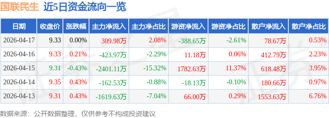 证券之星消息,截至2026年4月17日收盘,国联民生(601456)报收于9.33元,上涨0.0%,换手率0.37%,成交量15.98万手,成交额1.49亿元。