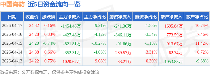 证券之星消息,截至2026年4月17日收盘,中国海防(600764)报收于24.32元,上涨0.16%,换手率0.92%,成交量6.56万手,成交额1.58亿元。