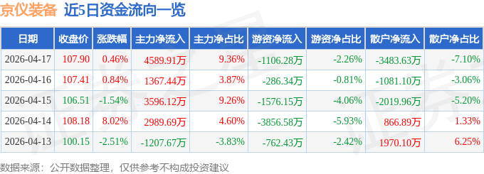 证券之星消息,截至2026年4月17日收盘,京仪装备(688652)报收于107.9元,上涨0.46%,换手率3.79%,成交量4.58万手,成交额4.9亿元。