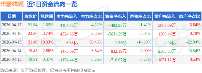 证券之星消息,截至2026年4月17日收盘,华菱线缆(001208)报收于21.84元,下跌1.62%,换手率18.32%,成交量48.21万手,成交额10.45亿元。
