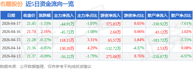 证券之星消息,截至2026年4月17日收盘,名雕股份(002830)报收于21.45元,下跌1.33%,换手率3.03%,成交量2.03万手,成交额4347.31万元。
