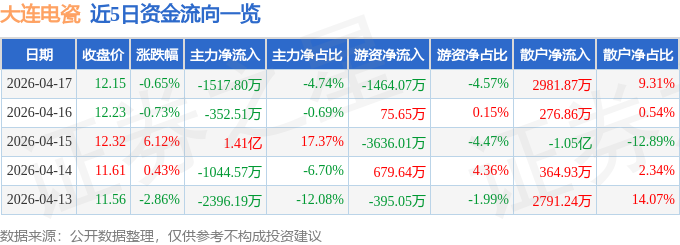 证券之星消息,截至2026年4月17日收盘,大连电瓷(002606)报收于12.15元,下跌0.65%,换手率6.27%,成交量26.41万手,成交额3.2亿元。