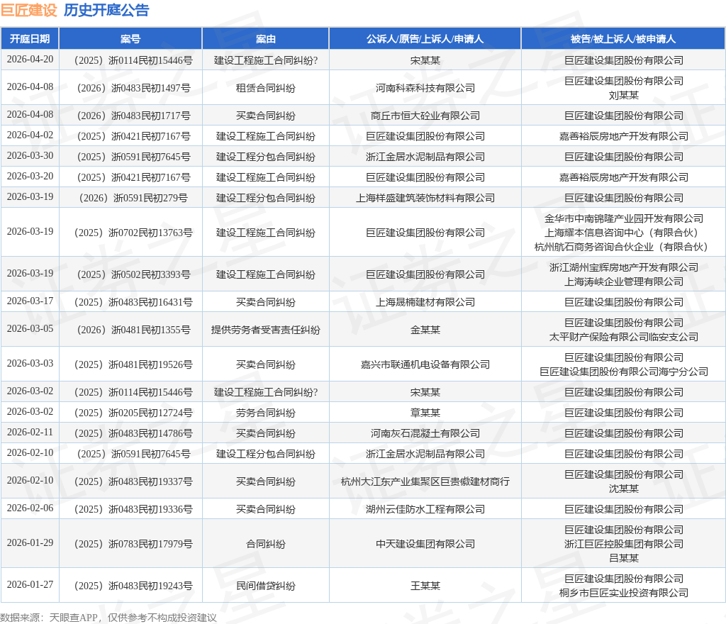 案号:(2025)浙0114民初15446号根据统计,近一年内以巨匠建设集团股份有限公司为当事人的历史开庭公告有207则,其中案由为“买卖合同纠纷”的公告以80则居首,其次为“合同纠纷”有27则,“建设工程施工合同纠纷”有16则。历史开庭公告(前20条)如下: