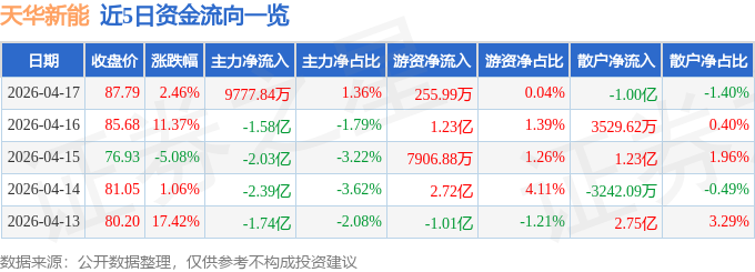 证券之星消息,截至2026年4月17日收盘,天华新能(300390)报收于87.79元,上涨2.46%,换手率12.22%,成交量82.15万手,成交额71.88亿元。