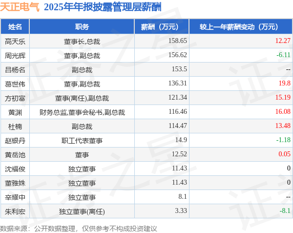 证券之星消息,天正电气发布2025年年报,数据显示:公司主营收入28.14亿元,同比减3.57%。归母净利润为9229.94万元,同比减23.95%。扣非净利润为8233.76万元,同比减32.94%。当年公司员工总数3076人,同比减5.27%。人均薪酬15.21万元(注:"人均薪酬"根据定期报告中"应付职工薪酬"附注的本期增加值 / 员工总数计算而来),同比增2.35%。人均创收91.49万元,同比增1.79%。人均创利3.0万元,同比减19.72%。其中管理层薪酬总额为1019.06万元,同比上一年增23.82%,薪酬最高的为董事长,总裁高天乐,薪酬158.65万元。