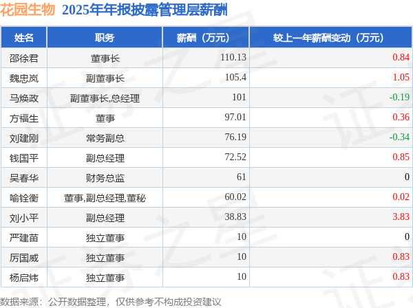 证券之星消息,花园生物发布2025年年报,数据显示:公司主营收入12.37亿元,同比减0.47%。归母净利润为3.05亿元,同比减1.41%。扣非净利润为2.9亿元,同比增12.96%。当年公司员工总数1163人,同比增13.91%。人均薪酬13.82万元(注:"人均薪酬"根据定期报告中"应付职工薪酬"附注的本期增加值 / 员工总数计算而来),同比减3.51%。人均创收106.4万元,同比减12.63%。人均创利26.21万元,同比减13.45%。其中管理层薪酬总额为752.1万元,同比上一年减0.3%,薪酬最高的为董事长邵徐君,薪酬110.13万元。