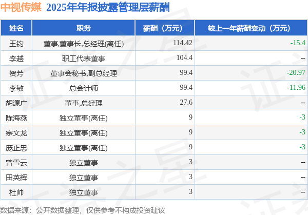 证券之星消息,中视传媒发布2025年年报,数据显示:公司主营收入10.37亿元,同比减8.79%。归母净利润为-1795.68万元,同比减140.95%。扣非净利润为-1522.43万元,同比减165.54%。当年公司员工总数1377人,同比减0.51%。人均薪酬27.88万元(注:"人均薪酬"根据定期报告中"应付职工薪酬"附注的本期增加值 / 员工总数计算而来),同比增1.05%。人均创收75.34万元,同比减8.33%。其中管理层薪酬总额为481.22万元,同比上一年减19.07%,薪酬最高的为董事,董事长,总经理(离任)王钧,薪酬114.42万元。