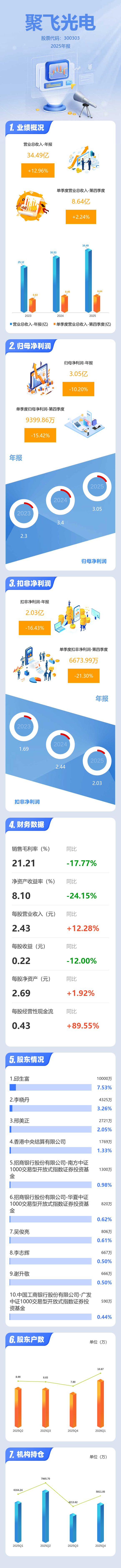 证券之星消息,聚飞光电2025年年报显示,当年度公司主营收入34.49亿元,同比上升12.97%;归母净利润3.05亿元,同比下降10.2%;扣非净利润2.03亿元,同比下降16.43%;其中2025年第四季度,公司单季度主营收入8.64亿元,同比上升2.25%;单季度归母净利润9399.86万元,同比下降15.43%;单季度扣非净利润6673.99万元,同比下降21.3%;负债率39.74%,投资收益1401.86万元,财务费用-918.51万元,毛利率21.21%。