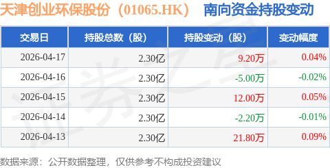 证券之星消息,4月17日南向资金增持9.2万股天津创业环保股份(01065.HK)。近5个交易日中,获南向资金增持的有3天,累计净增持35.8万股。近20个交易日中,获南向资金增持的有12天,累计净增持75.2万股。截至目前,南向资金持有天津创业环保股份(01065.HK)2.3亿股,占公司已发行普通股的67.72%。