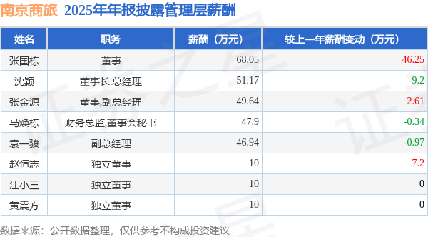 证券之星消息,南京商旅发布2025年年报,数据显示:公司主营收入7.45亿元,同比减4.08%。归母净利润为884.26万元,同比减80.63%。扣非净利润为730.7万元,同比增29.21%。当年公司员工总数499人,同比减9.11%。人均薪酬20.76万元(注:"人均薪酬"根据定期报告中"应付职工薪酬"附注的本期增加值 / 员工总数计算而来),同比增10.15%。人均创收149.25万元,同比增5.53%。人均创利9.67万元,同比减41.99%。其中管理层薪酬总额为293.7万元,同比上一年减8.6%,薪酬最高的为董事张国栋,薪酬68.05万元。