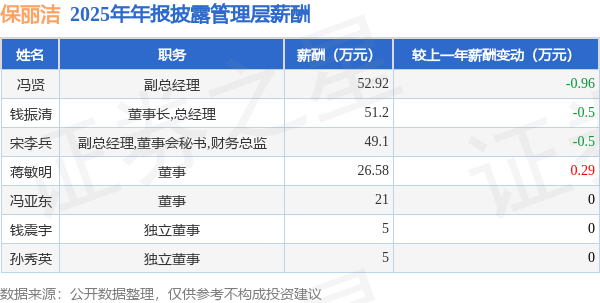 证券之星消息,保丽洁发布2025年年报,数据显示:公司主营收入2.0亿元,同比增3.53%。归母净利润为2481.58万元,同比增9.54%。扣非净利润为2196.63万元,同比增10.73%。当年公司员工总数343人,同比增4.57%。人均薪酬17.51万元(注:"人均薪酬"根据定期报告中"应付职工薪酬"附注的本期增加值 / 员工总数计算而来),同比增22.61%。人均创收58.36万元,同比减1.0%。人均创利7.23万元,同比增4.75%。其中管理层薪酬总额为210.8万元,同比上一年减34.42%,薪酬最高的为副总经理冯贤,薪酬52.92万元。