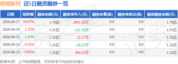 明冠新材融资融券信息显示,融资方面,当日融资买入9018.65万元,融资偿还5127.09万元,融资净买入3891.56万元。融券方面,融券卖出0.0股,融券偿还0.0股,融券余量0.0股,融券余额0.0万元。融资融券余额1.7亿元。