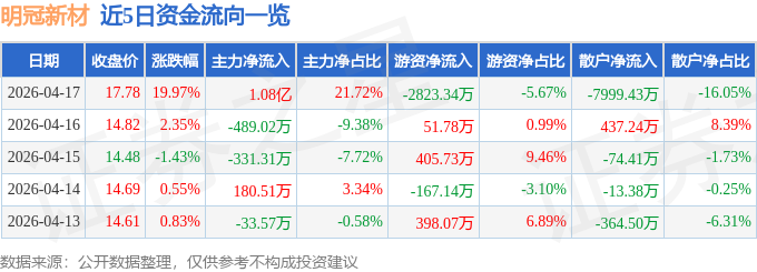 证券之星消息,截至2026年4月17日收盘,明冠新材(688560)报收于17.78元,上涨19.97%,涨停,换手率14.75%,成交量29.7万手,成交额4.98亿元。