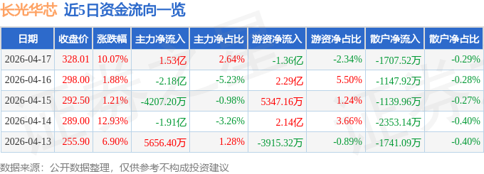 证券之星消息,截至2026年4月17日收盘,长光华芯(688048)报收于328.01元,上涨10.07%,换手率10.08%,成交量17.76万手,成交额57.92亿元。