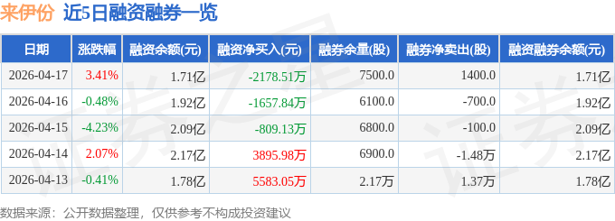 证券之星消息,截至2026年4月17日收盘,来伊份(603777)报收于17.0元,上涨3.41%,换手率10.11%,成交量33.83万手,成交额5.68亿元。